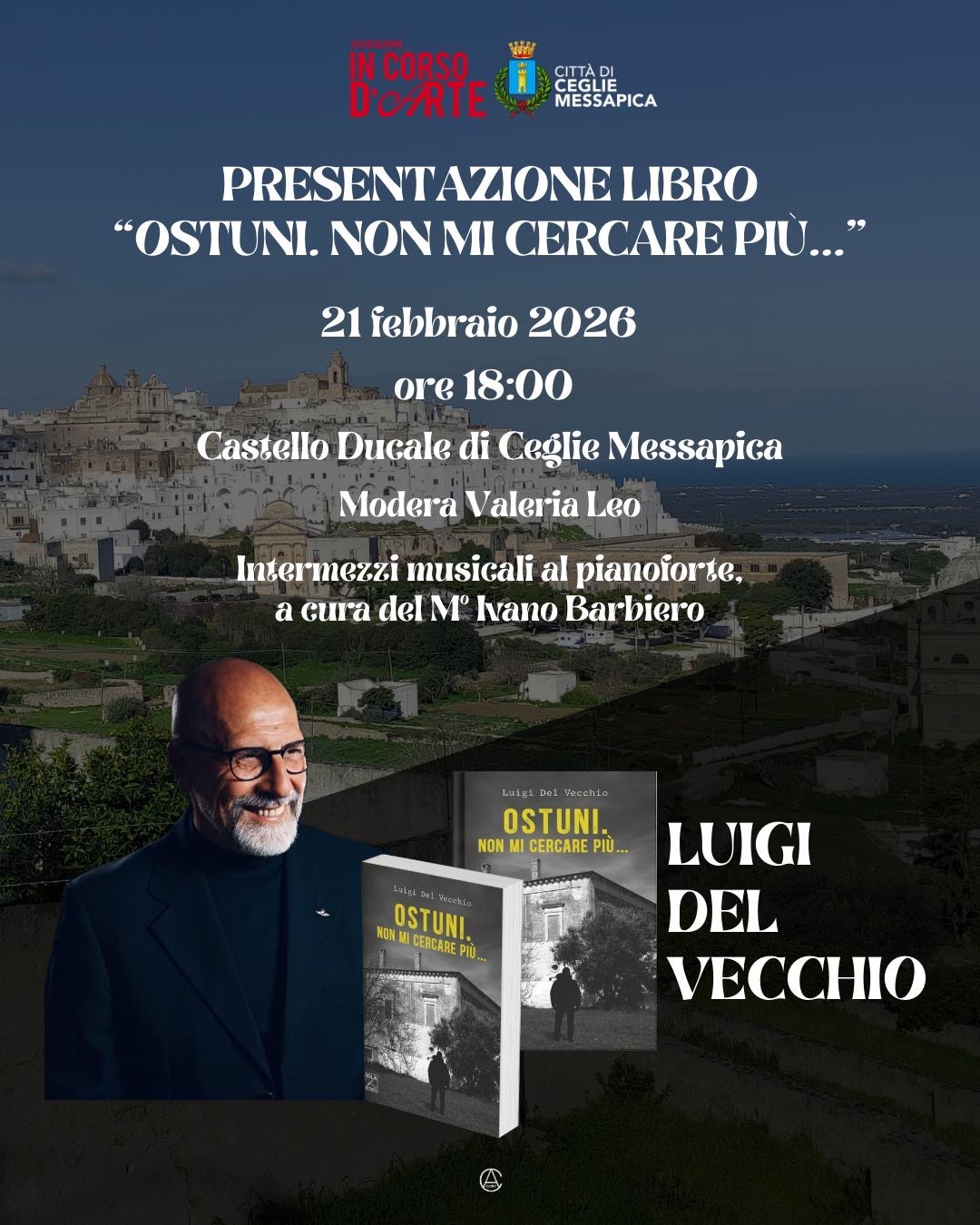 Sabato 21 febbraio, alle ore 18.00, nella suggestiva cornice del Castello Ducale di Ceglie Messapica, Luigi Del Vecchio presenterà il suo secondo thriller “Ostuni. Non mi cercare più…”, edito da Viola Editrice, riportando al …