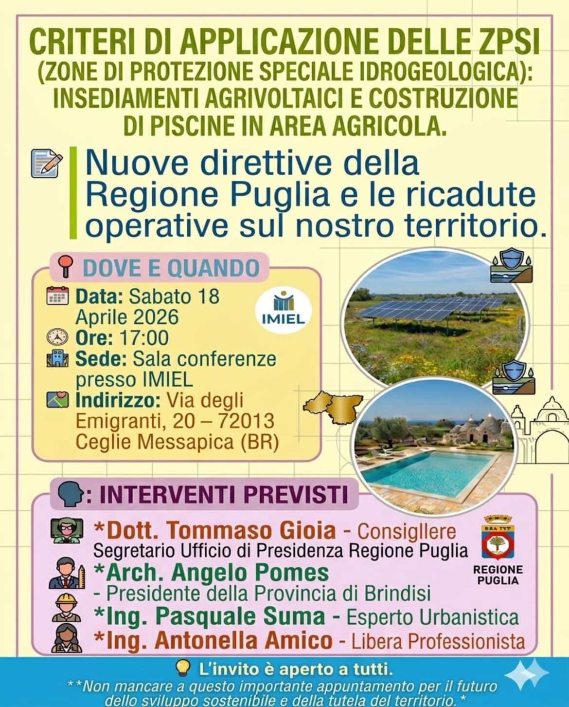 Agrivoltaico e piscine in aree agricole al centro del dibattito: esperti e istituzioni a confronto per definire il futuro del territorio brindisino. CEGLIE MESSAPICA, 17/04/2026 – In un momento storico …