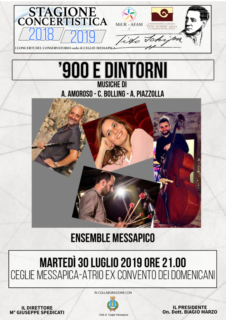 Nell’ambito della Stagione concertistica “I Concerti del Conservatorio”, organizzata dal Conservatorio Tito Schipa per la sua sede staccata di Ceglie Messapica, è inserito un concerto previsto per Martedi 30 Luglio 2019, alle ore 21.00, presso il Cortile del Castello a Ceglie Messapica Il programma prevede brani molto noti, come il famosissimo e melanconico Oblivion di A. Piazzolla per Flauto e JazzPianoTrio, ed altri di rara esecuzione, come percussionf lauto, per Flauto e Percussioni, del compsitore italo-tedesco Antonio Amoroso, dedicato a Luigi Bisanti. Sempre di A. Amoroso si eseguirà Apparizione di Beatrice per Flauto e Pianoforte, e, a conclusione del programma, sarà eseguita di C. Bolling la Suite n. 2 for Flute and JazzPianoTrio