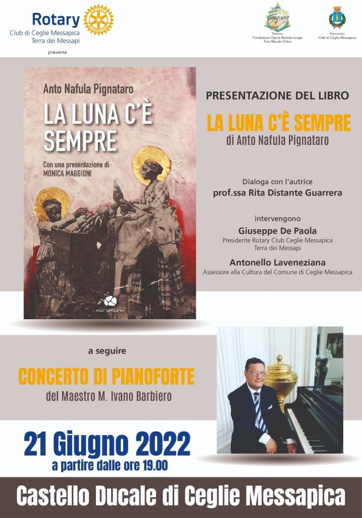 - MARTEDÌ 21 GIUGNO, DALLE ORE 19.00 AL CASTELLO DUCALE: PRESENTAZIONE DEL LIBRO “LA LUNA C’È SEMPRE” A CURA DEL ROTARY CLUB “TERRA DEI MESSAPI” E CONCERTO DEL PIANISTA IVANO BARBIERO.