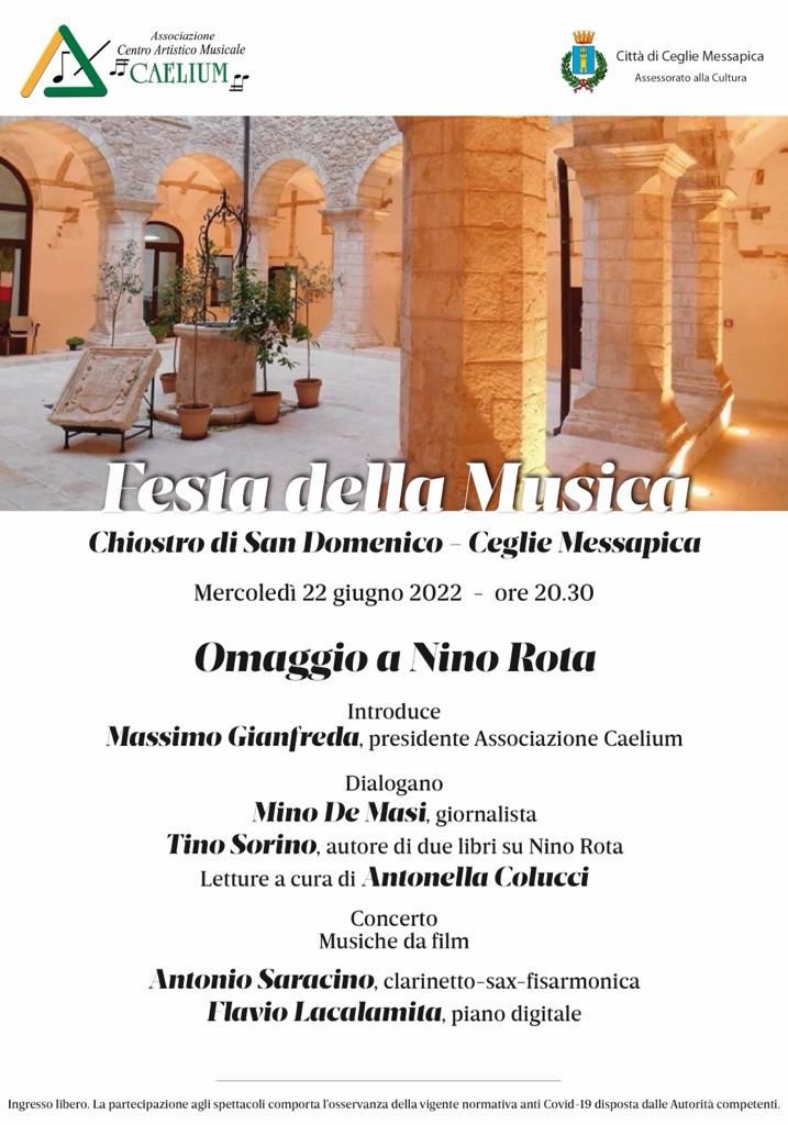 - MERCOLEDÌ 22 GIUGNO, ORE 20.30 NEL CHIOSTRO DEI DOMENICANI (MED COOKING SCHOOL): PRESENTAZIONE DEL LIBRO “OMAGGIO A NINO ROTA” E CONCERTO A CURA DEL CENTRO ARTISTICO MUSICALE “CAELIUM”.