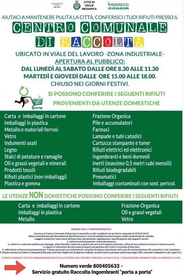 Il territorio è un bene di tutti, pertanto si invitano i cittadini a usufruire del servizio gratuito di “Raccolta Ingombranti” con modalità “porta a porta”, telefonando al numero verde della ditta Cogeir 800405633, o, in alternativa a conferire presso il Centro Comunale di Raccolta (ubicato in viale del Lavoro – Zona Industriale), aperto dal lunedì al sabato, dalle ore 8.30 alle 11.30, martedì e giovedì anche in orario pomeridiano dalle ore 15 alle ore 18, dove è possibile conferire riciclabili e ingombranti.