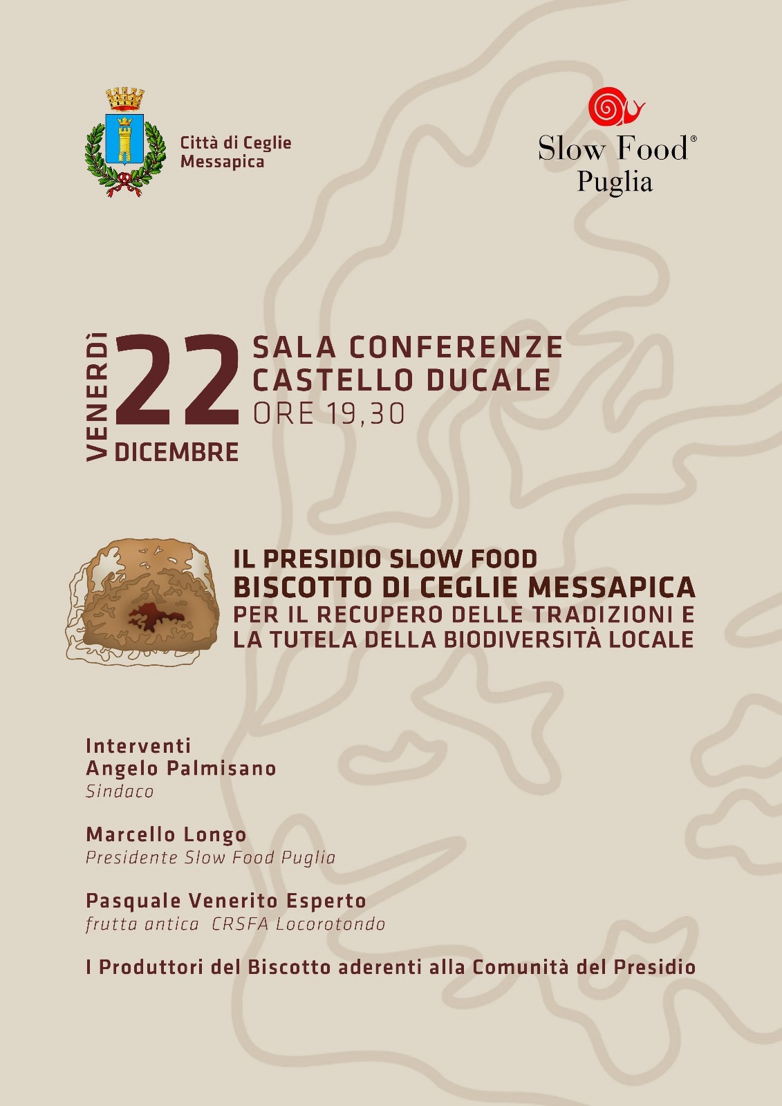 Si svolgerà venerdì 22 dicembre, dalle ore 19.30, presso la sala conferenze del Castello Ducale, l’evento “Il Presidio Slow Food – Biscotto di Ceglie Messapica – per il recupero delle tradizioni e la tutela della biodiversità locale”.