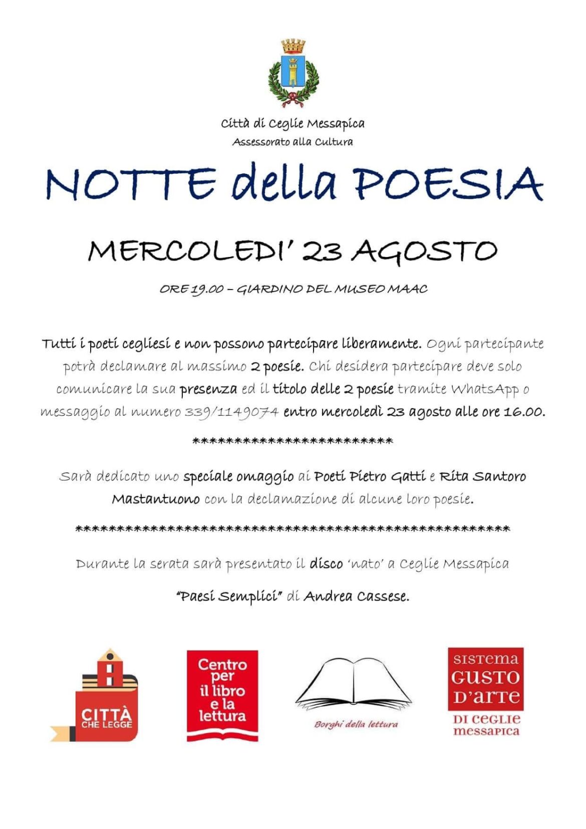 Mercoledì 23 agosto a partire dalle ore 19.00 presso il Museo MAAC – Giardino della Poesia “Rita Santoro Mastantuono” si terrà l’edizione 2023 della “Notte della Poesia”.Possono partecipare liberamente tutti …