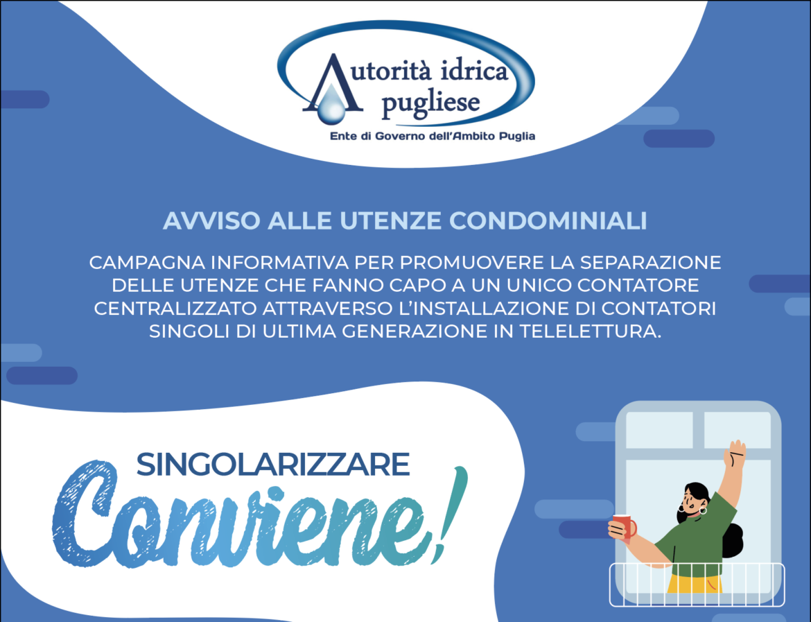 Contatori per ogni unità immobiliare delle utenze idriche dei condomìni, si scrive “singolarizzare”, si legge: risparmio, consapevolezza, trasparenza. È questo il senso delle azioni avviate dall’Autorità Idrica Pugliese, di concerto con l’ente …