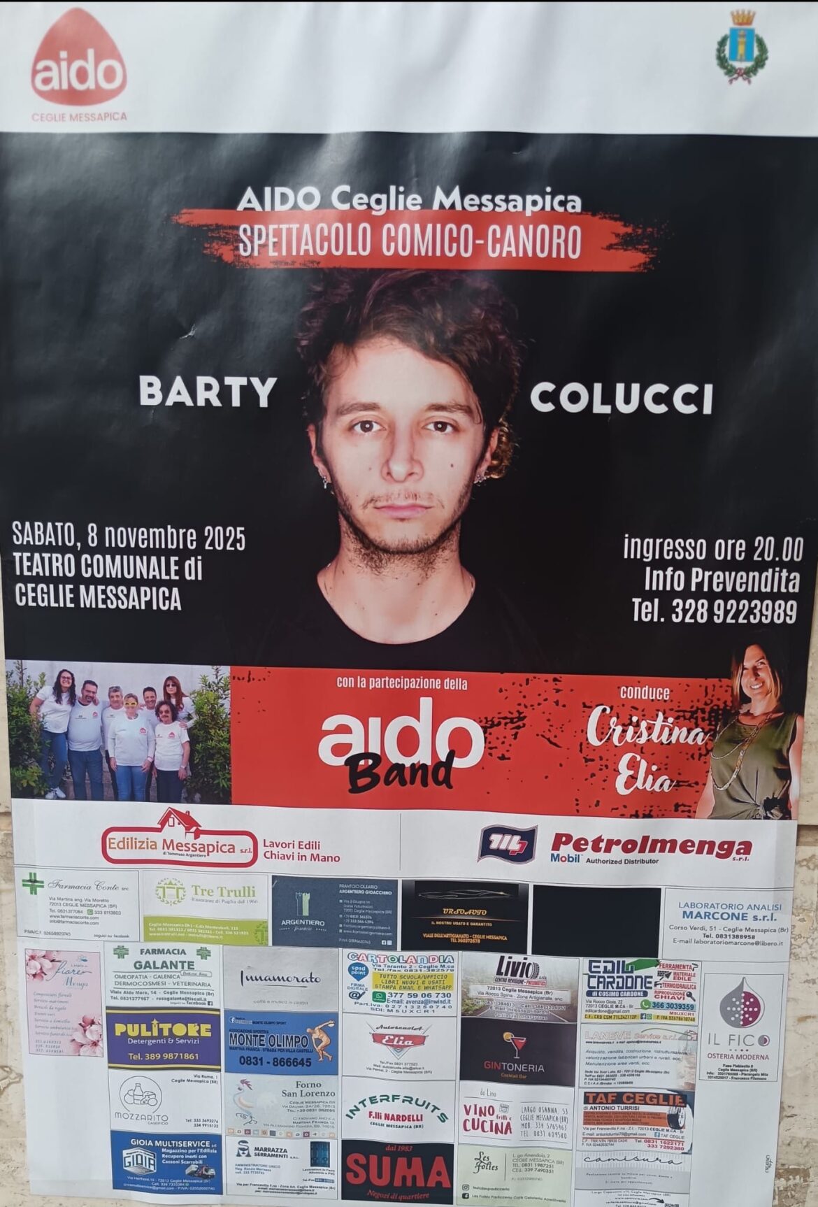 Sabato 8 novembre, teatro comunale di Ceglie Messapica, spettacolo comico – canoro con Barty Colucci e l’ “A.I.D.O.Band”. Una serata volta a festeggiare il terzo anniversario dell’A.I.D.O. a Ceglie Messapica organizzata, con il patrocinio dell’Amministrazione Comunale, dal Presidente dottor Cosimo Colucci, al fine di sensibilizzare …