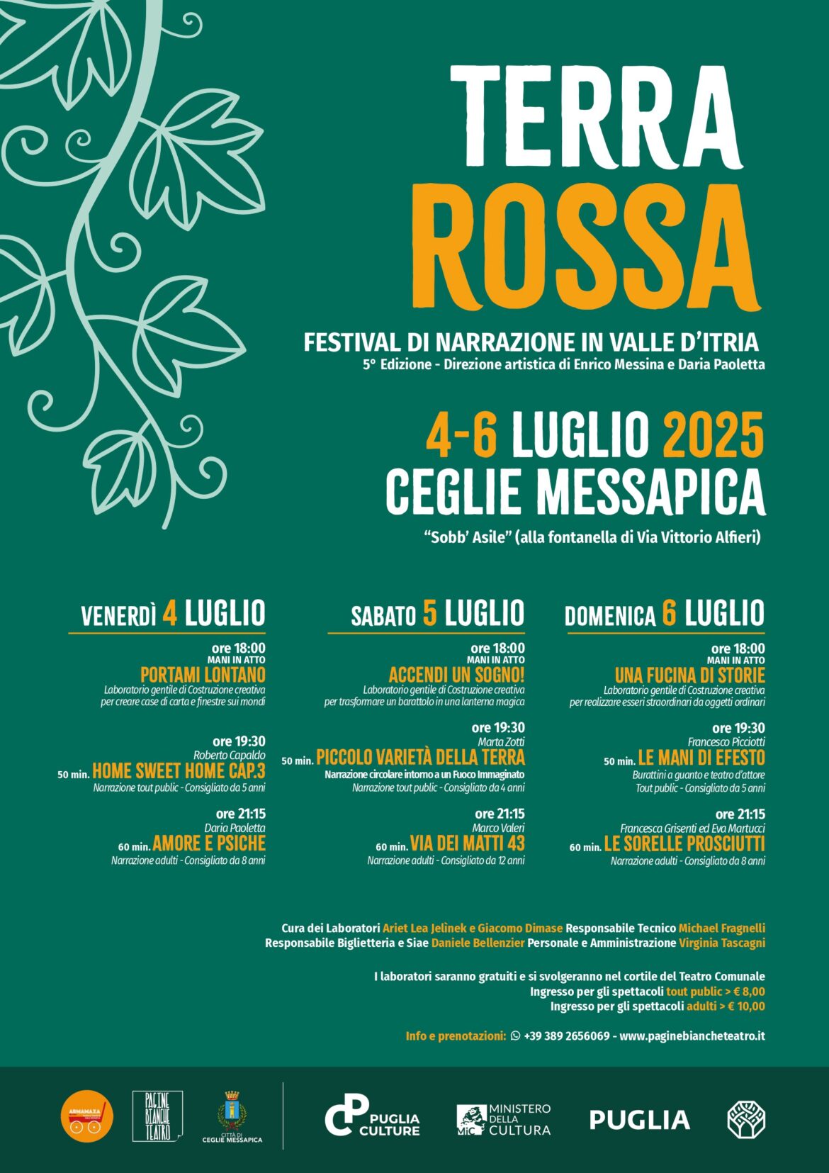6 spettacoli di narrazione e 3 laboratori gratuiti per i bambini: ritorna a Ceglie Messapica, dal 4 al 6 luglio 2025, la V edizione di Terra Rossa, il Festival di …