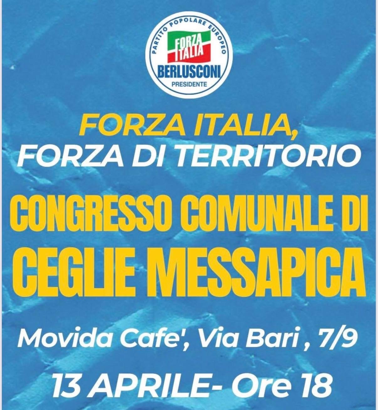 Sarà celebrato domenica 13 aprile, il Congresso Cittadino di Forza Italia a Ceglie Messapica. L’appuntamento è alle ore 18 presso il Movida Cafè. A darne notizia è il consigliere comunale, nonché attuale commissario del partito, Giovanni Gianfreda . L’occasione per il partito di Berlusconi sarà anche quella di iniziare a tracciare le linee programmatiche a Ceglie Messapica verso le amministrative del prossimo anno. Da Gianfreda non mancherà sicuramente un richiamo agli alleati, dai più vicini ai più lontani, per iniziare a costruire il centro destra che dovrà presentarsi alle prossime elezioni. Rumors fanno pensare che dal congresso potrebbe esserci l’ultimatum e ultima chiamata al Consigliere Regionale e Segretario Provinciale di Fratelli d’Italia Luigi Caroli, anch’egli impegnato nel tour quasi completato dei congressi cittadini, per la verità manca solo Ceglie Messapica, affinché si capisca definitivamente Fratelli d’Italia da quale parte sta o vorrà stare, con il centro destra unito o con l’attuale Sindaco di “Fratelli d’Italia” Angelo Palmisano?