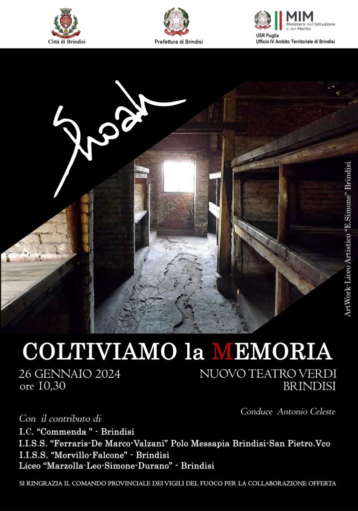 Venerdì 26 gennaio, alle 10.30, avrà luogo presso il Nuovo Teatro Verdi di Brindisi la cerimonia commemorativa del “Giorno della Memoria”, istituito in occasione della ricorrenza della liberazione del campo di concentramento di Auschwitz, per ricordare le vittime dell’Olocausto.