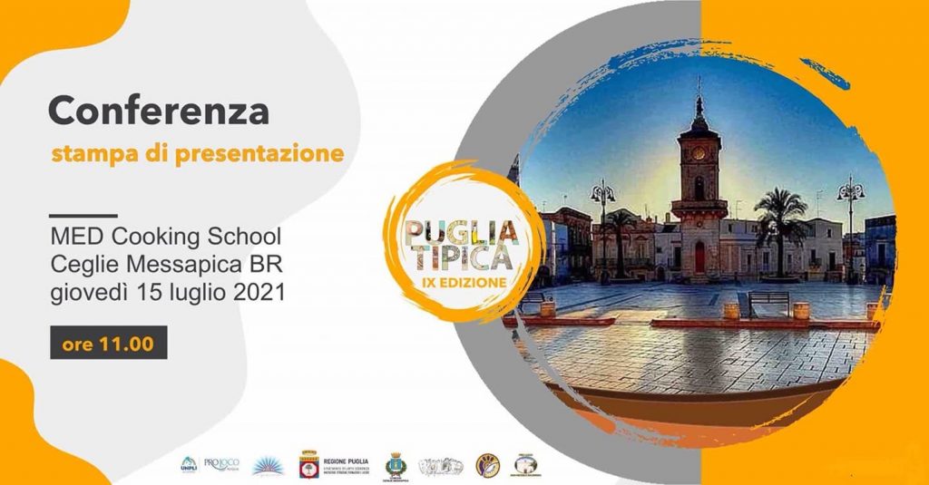 Giovedi 15 luglio alle ore 11.00 presso la sala della scuola internazionale di cucina mediterranea del borgo medievale messapico, il presidente del comitato regionale Unpli Rocco Lauciello, presiederà la conferenza stampa di presentazione dell’evento Puglia Tipica, affiancato dai tre presidenti delle pro Loco organizzatrici Cristina Elia(Pro Loco Ceglie Messapica), Madia Trinchera (Pro Loco Ostuni) Cosimino Bellanova (Pro Loco San Michele Salentino) e dal Sindaco Angelo Palmisano e dall’assessore Antonello Laveneziana del comune di Ceglie Messapica. Nell’occasione sarà presentato il programma dettagliato della manifestazione.