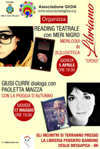 Giovedì 17 maggio, alle ore 19, Paoletta Maizza ci racconterà la storia di Giulietta e Jean nel “Con la pioggia d’Autunno” (Lettere Animate). Un viaggio, due mondi che si incontrano. Giulietta, giovane e arrabbiata con la vita, Jean uomo solitario e schivo. La Puglia, la pioggia, la famiglia, il passato e il presente che si incrociano in un puzzle di coincidenze che porteranno solo a un punto, all’amore. A dispetto di ogni cosa, persino degli ostacoli del cuore e delle scelte obbligate, Giulietta e Jean si diranno mai “ti amo”? Capiranno che la vita è fatta di sorprese e di rinascita? Un romanzo che è allo stesso tempo leggero e denso di spunti di riflessione sull’amore, sull’amicizia, sulle relazioni tra genitori e figli.