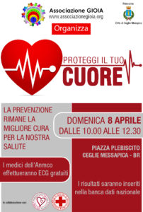 La giornata è organizzata grazie alla collaborazione della Fondazione per il tuo cuore (Heart Care Foundation), della Croce Rossa Italiana – sezione di Carovigno (Br), con il Patrocinio del Comune di Ceglie Messapica.