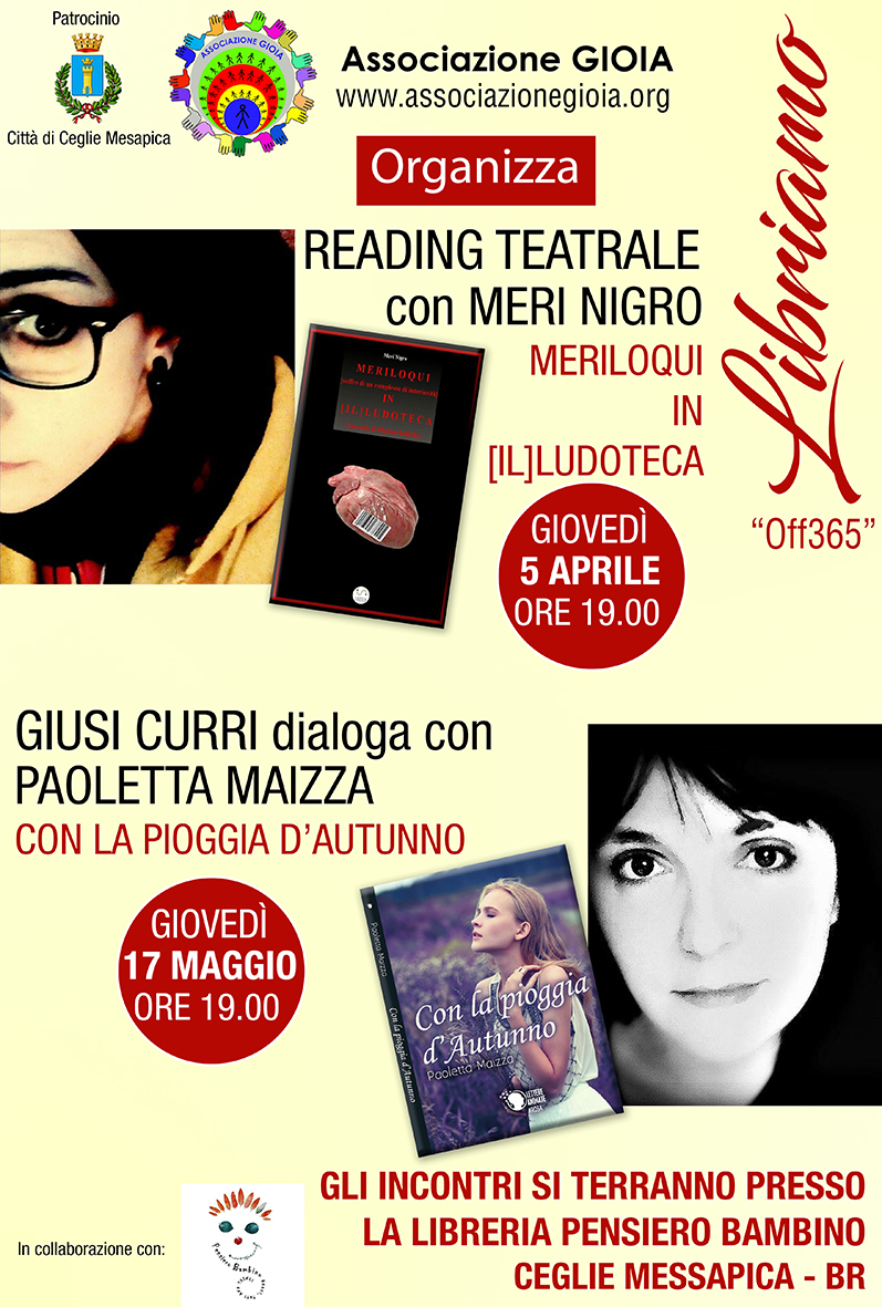 Torna “LibriamOff365” con due appuntamenti ad aprile e maggio, sempre in collaborazione con la libreria “Pensiero Bambino” di Ceglie Messapica, patrocinati dal Comune.