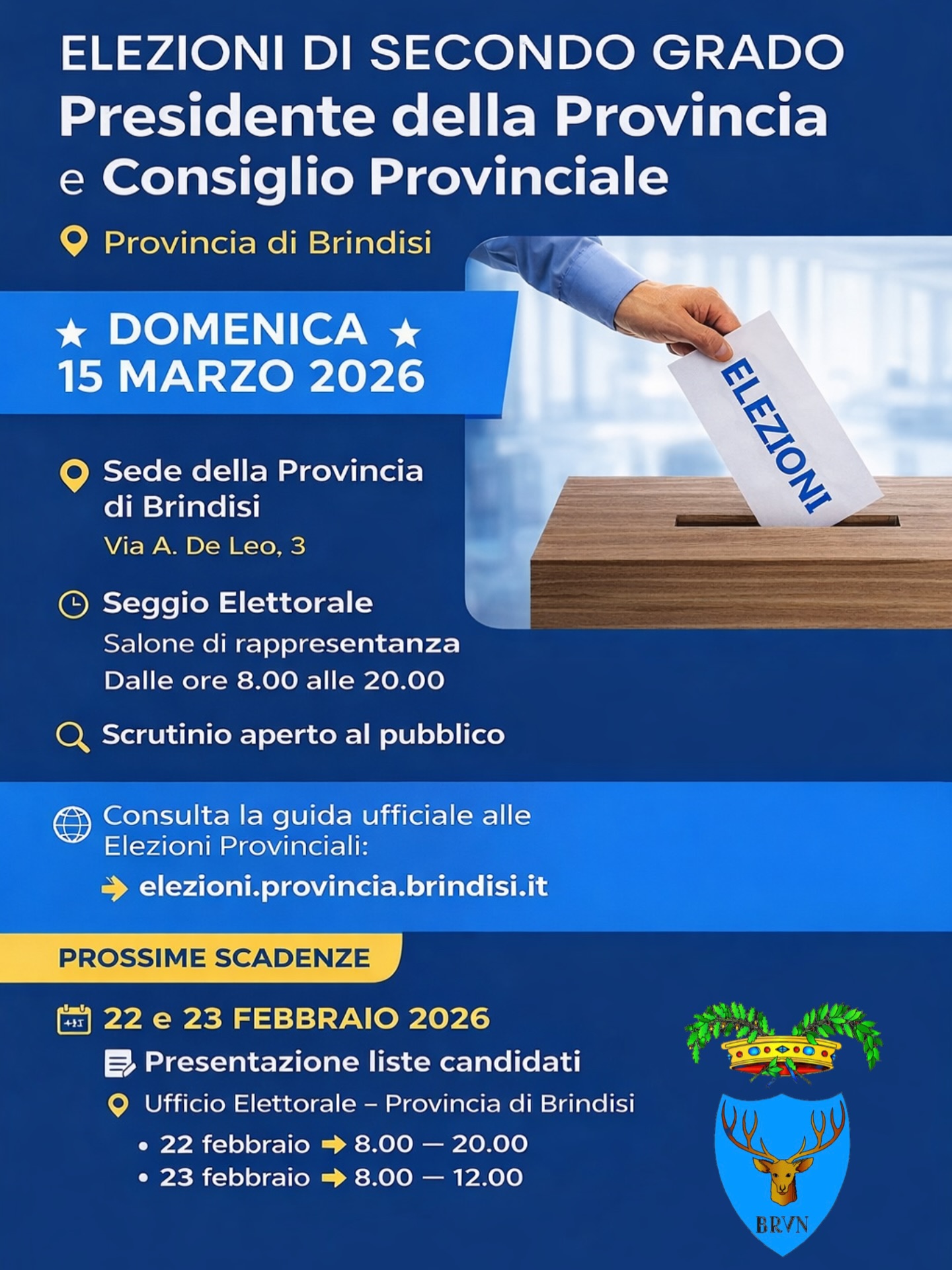 L’appuntamento con le urne è fissato per domenica 15 marzo 2026. Le operazioni di voto si svolgeranno presso la sede della Provincia di Brindisi, in Via A. De Leo n. 3, dalle ore 8:00 alle ore 20:00.