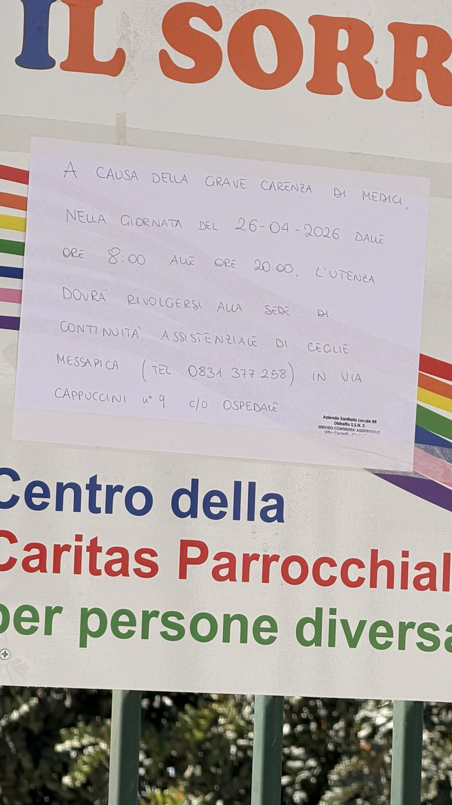 Questa mattina, a seguito del confronto con diversi cittadini presenti sul posto, è emerso un quadro di forte disorganizzazione: molte persone si sono recate presso la sede di continuità assistenziale convinte che il servizio fosse regolarmente attivo, ma hanno trovato un servizio non garantito e un semplice cartello scritto a mano, poco visibile, che indicava il trasferimento a Ceglie Messapica, senza alcuna comunicazione ufficiale preventiva.