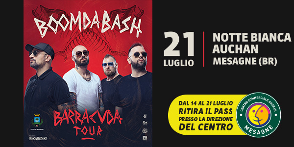 Ora i BoomDaBash arrivano a Mesagne per un grande concerto gratuito. Sabato 21 luglio alle ore 21 la band si esibirà al Centro Commerciale Auchan in una tappa del Barracuda Tour. Sarà un’occasione imperdibile per ascoltare vecchi e nuovi successi tra ritmi in levare, calore e tanta energia. Il concerto si terrà all’esterno, nel parcheggio del Centro, sulla Strada Statale 7 km 10 a Mesagne.