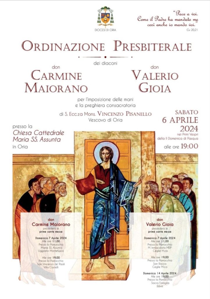 Sabato 6 aprile 2024, nei Primi Vespri della II Domenica di Pasqua, presso la Cattedrale di Oria, per l’imposizione delle mani e la preghiera consacratoria del vescovo Vincenzo, i diaconi don Carmine Maiorano e don Valerio Gioia saranno ordinati presbiteri.