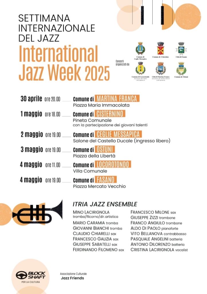 Il cuore pulsante della Puglia si prepara ad accogliere la 3a edizione della Settimana Internazionale del Jazz 2025, un evento musicale frutto della sinergia tra sei comuni del territorio: Ceglie Messapica, Cisternino, Fasano, Locorotondo, Martina Franca e Ostuni.