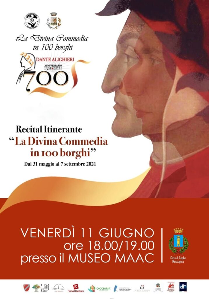 “La Divina Commedia in 100 borghi”, viaggio itinerante in cento località italiane, che ha preso il via il 31 maggio dalla città siciliana di Comiso e terminerà il 7 settembre 2021 a Ripi, nel Lazio, arriva a Ceglie Messapica venerdì 11 giugno 2021, alle ore 18.00 presso il Museo MAAC.