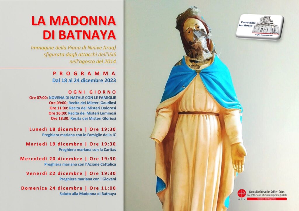 La piccola statua della Vergine Maria Incoronata di Batnaya, cittadina della Piana di Ninive, nel nord Iraq, arriverà a Ceglie Messapica, domenica 17 dicembre alle ore 18.00 e sarà esposta pubblicamente presso la chiesa di San Rocco alla presenza di S.E. Mons. Vincenzo Pisanello, Vescovo di Oria e del Parroco Don Lorenzo Elia.