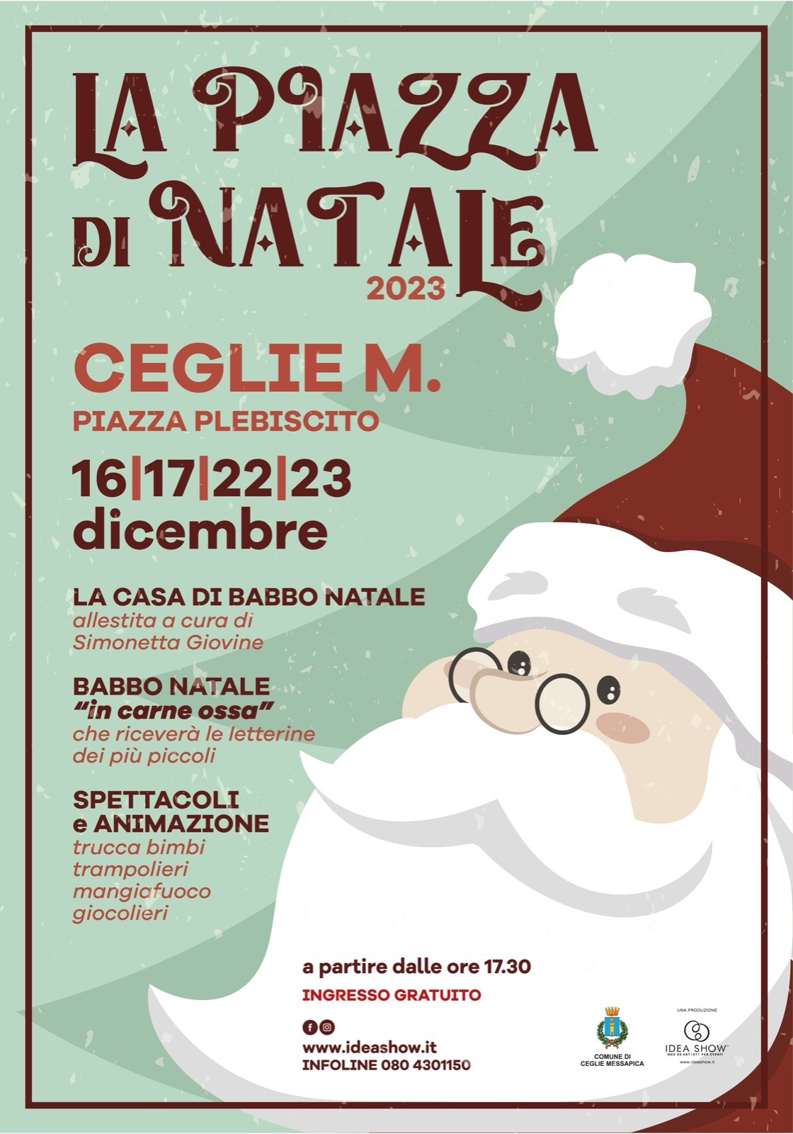 - Inoltre, domenica 17 dicembre, presso le chiese e le piazze della città, dalle ore 9.00 alle ore 12.00 concerti itineranti de “La Banda di Natale” a cura dell’ Ass. Giovani Musicisti, mentre in mattinata dalle ore 11, in piazza Plebiscito, “Gran Concerto di Natale”, con la Scuola dell’Infanzia, la Scuola Primaria e la Scuola Secondaria di Primo Grado del Secondo IC a cura del Secondo Istituto Comprensivo di Ceglie Messapica.