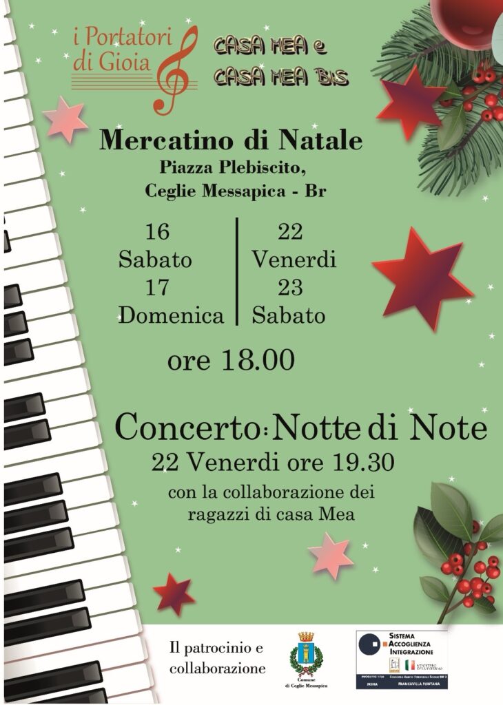 - Domenica 17 dicembre, dalle 17 alle 20, sarà allestito anche un “Mercatino Solidale” a cura del Branco dei Lupetti “Rupe della Pace” dell’AGESCI Gruppo Scout Ceglie Messapica.