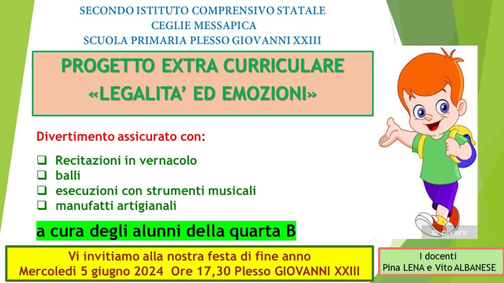 Al termine del progetto Extra Curriculare “Legalità ed Emozioni” gli alunni della quarta B del II Comprensivo Statale – Scuola Primaria plesso Giovanni XXIII, guidati dai maestri Pina Lerna e Vito Albanese, si esibiranno in una serie di momenti che garantiranno un divertimento assicurato. L’appuntamento è alle ore 17,30 di mercoledì 5 giugno presso la scuola Giovanni XXIII.
