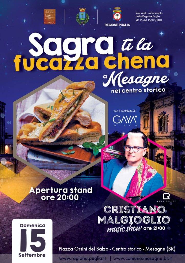 “Sono soddisfatto, al di là delle formule, per questo evento che si consolida e insieme si rinnova. Perché punta alla promozione delle tradizioni e alla valorizzazione dei prodotti locali, perché è un’occasione attraente per bongustai e turisti della gastronomia ma anche per coloro che hanno a cuore la storia della nostra comunità. Anche per queste ragioni, sono grato agli organizzatori che hanno curato ogni dettaglio affinchè questa iniziativa esalti Mesagne per le sue molteplici bellezze” è stato il commento del sindaco Toni Matarrelli alla conferenza stampa di presentazione della “Sagra ti la fucazza chena”, in programma a Mesagne domenica 15 settembre. L’appuntamento, organizzato dal Duc “Castrum Medianum,” con il contributo di “Gayà Disco”, è patrocinato dal comune di Mesagne. Gli stand gastronomici saranno inaugurati alle ore 20 e offriranno la possibilità di apprezzare i sapori della migliore tradizione mesagnese: focaccia ripiena – secondo l’antica ricetta – ma anche altre sorprese gastronomiche dal gusto antico e rivisitato dalle mani dei ristoratori e dallo Sprar che aderisce all’iniziativa. La libreria “Spazio d’Autore”, nello spazio antistante al locale in piazza Commestibili, ha previsto un momento musicale con Tommaso Manfredi alle ore 21, un viaggio di parole e musica alla scoperta del flamenco andaluso. In piazza Criscuolo alle ore 20,30 è previsto uno spettacolo di artisti di strada. In piazza Orsini del Balzo alle ore 21 si terrà il concerto di Cristiano Malgioglio, interprete e brillante autore di numerosi brani di successo scritti per importanti esponenti della musica italiana: Mina, Vanoni, Celentano e Carrà solo per citare i più noti.