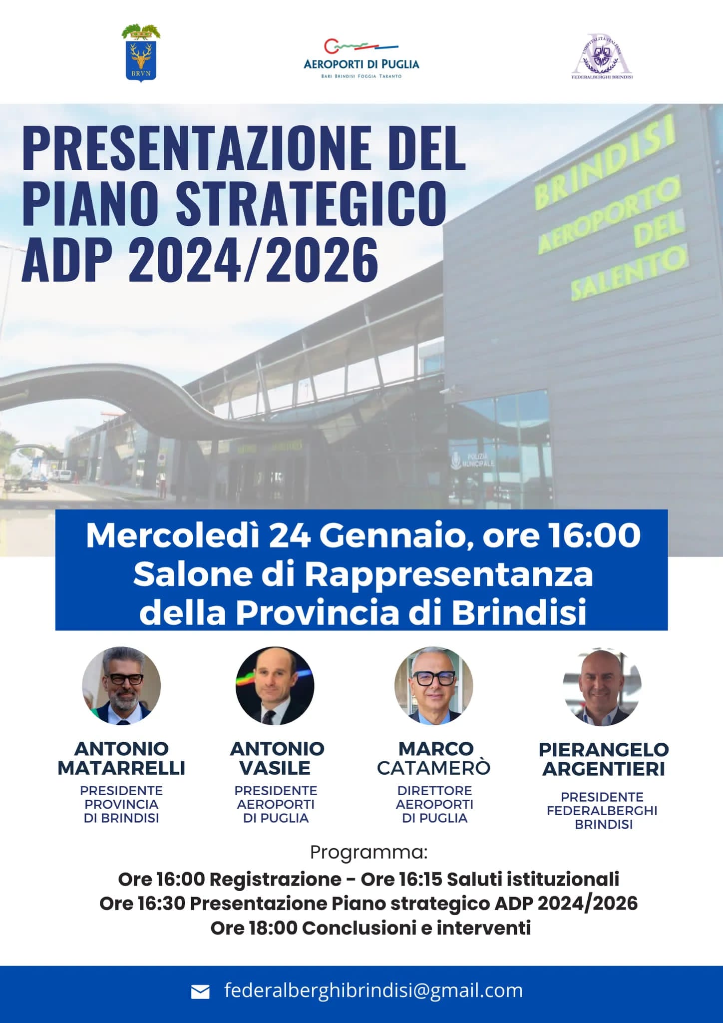 Mercoledì 24 gennaio, alle ore 16:00, nel salone di rappresentanza della Provincia di Brindisi si svolgerà l’incontro organizzato da Federalberghi Brindisi, in collaborazione con Aeroporti di Puglia e Provincia di Brindisi, dal titolo “Presentazione del Piano Strategico ADP 2024/2026”. Partecipano il Presidente di Aeroporti di Puglia Antonio Vasile, il Direttore di Aeroporti di Puglia Marco Catamerò, il Presidente della Provincia di Brindisi Antonio Matarrelli e il Presidente di Federalberghi Brindisi Pierangelo Argentieri.