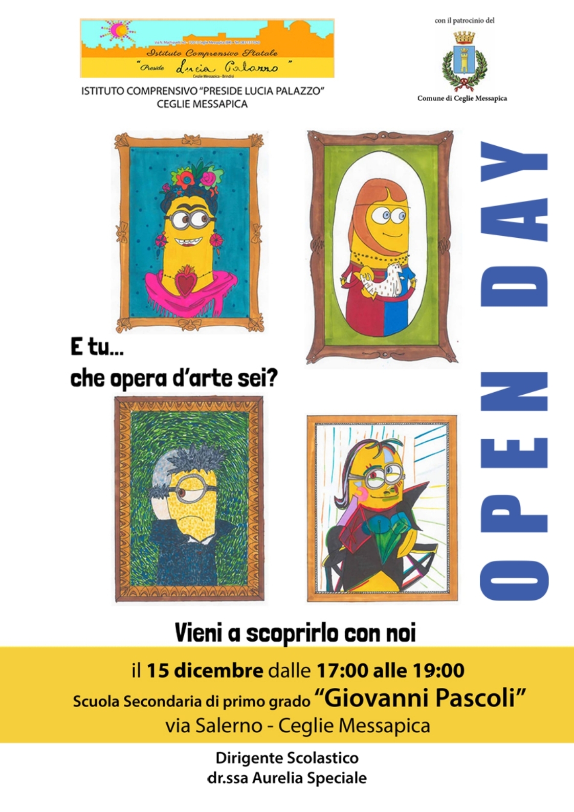 La Dirigente Scolastica Aurelia Speciale ed i Docenti invitano i genitori e gli alunni delle classi quinte della città all’Open Day “E tu… che opera d’arte sei?” della scuola secondaria “G. Pascoli”, che si terrà il prossimo 15 dicembre 2022 presso la sede della scuola G. Pascoli in via Salerno, dalle ore 17:00 alle ore 19:00.
