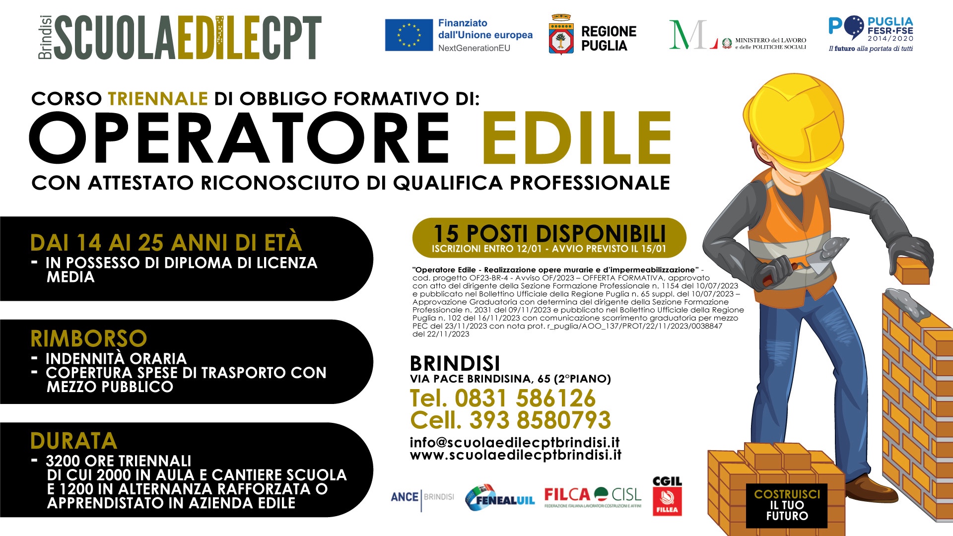 La Scuola Edile Cpt di Brindisi organizza un corso triennale di obbligo formativo per Operatore Edile con attestato riconosciuto di qualifica professionale. Possono partecipare tutti coloro che sono in possesso della licenza media, dai 14 ai 25 anni. I posti disponibili sono 15. Le iscrizioni entro il 12 gennaio 2024. L’inizio del corso é previsto per il 15 gennaio 2024. E’ previsto un rimborso spese di trasporto con mezzi pubblici e una indennità oraria.