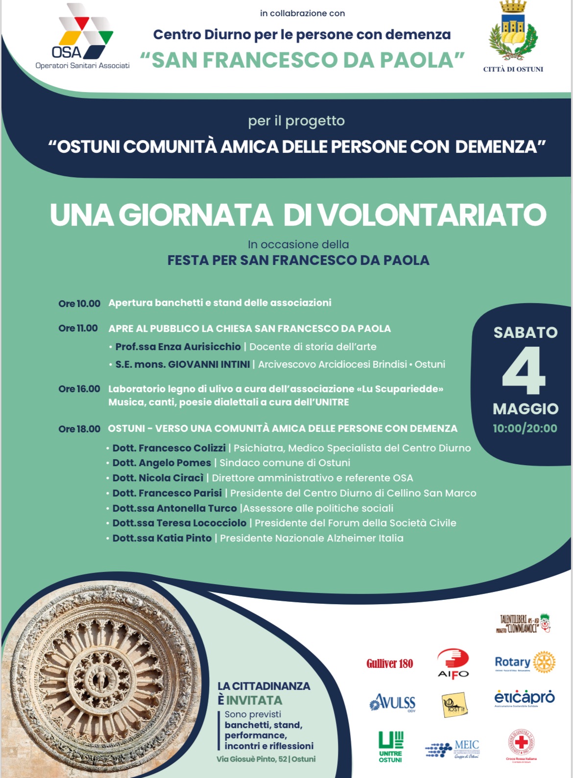 “Una Giornata di Volontariato” sarà il tema della manifestazione organizzata per sabato 4 maggio presso il Centro Diurno per le persone con demenza “San Francesco da Paola” di via Giosuè Pinto, gestito dalla Cooperativa OSA (Operatori Sanitari Associati), con il patrocinio dell’Amministrazione comunale di Ostuni e la partecipazione di associazioni impegnate nel sociale come Rotary, Croce Rossa, Talentiliberi, Eticapro, AIFO, Gulliver180, MEIC, Unitre, Lu scupariedde e dal Forum delle Associazioni.