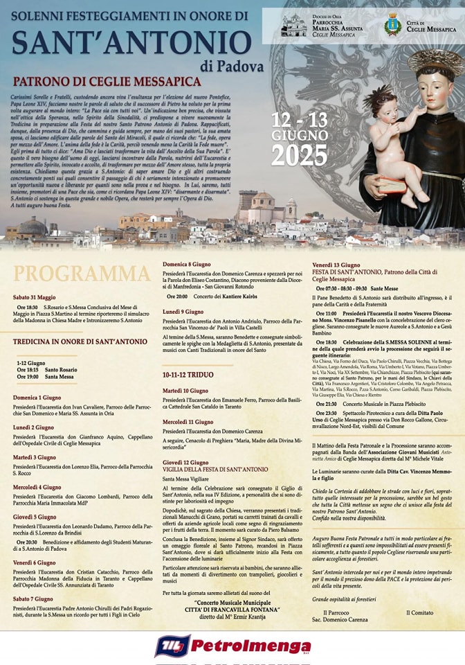 Giovedì 12 giugno 2025, vigilia della Festa di Sant’ Antonio di Padova, Santo Patrono di Ceglie Messapica.
