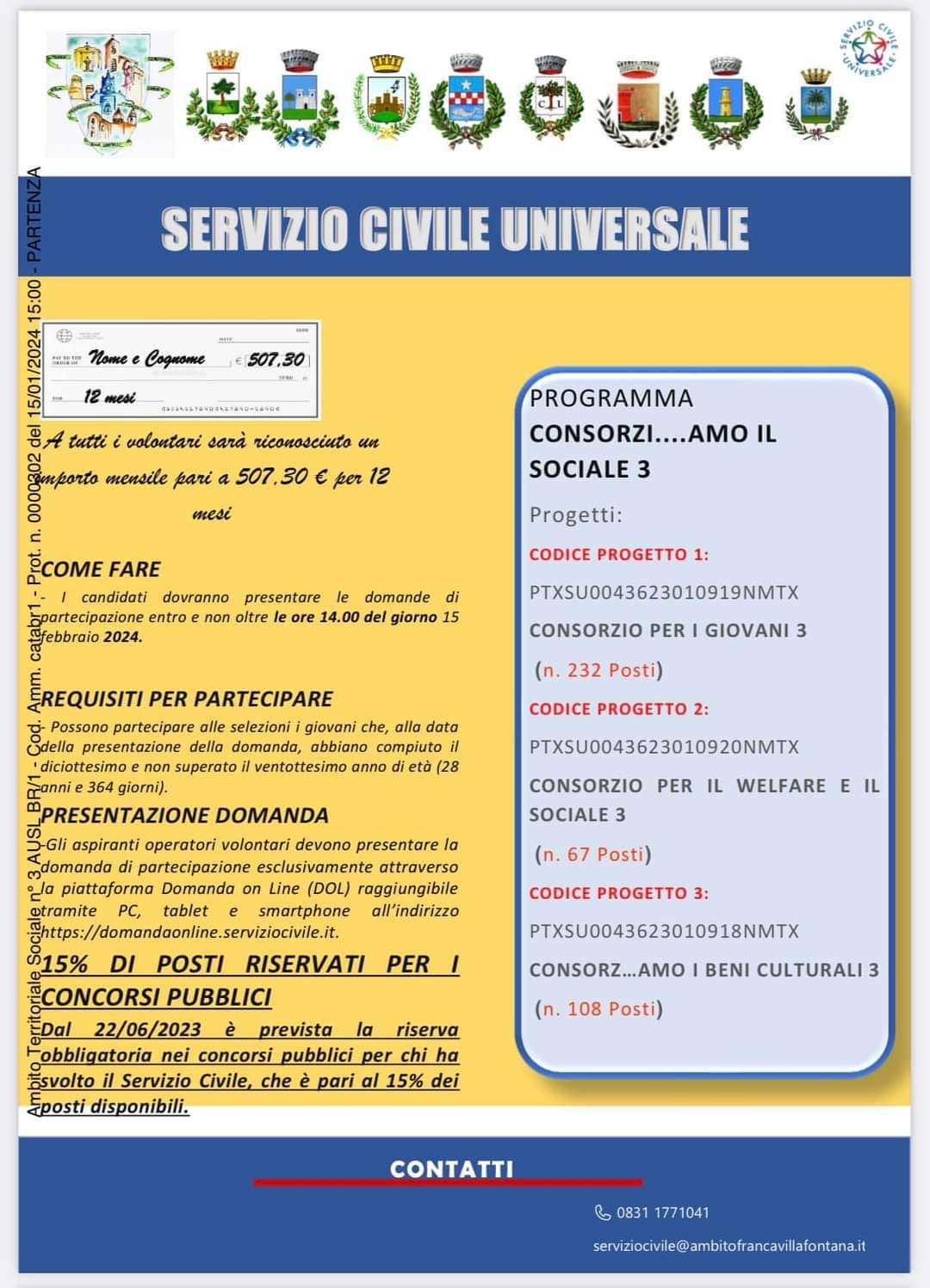 Fino alle ore 14:00 del venerdì 15 febbraio 2024 è possibile presentare domanda di partecipazione ad uno dei 3 progetti che si realizzeranno tra il 2024 e il 2025 sul territorio dei Comuni di Ceglie Messapica, Carovigno, Francavilla Fontana, Oria, San Michele Salentino, Villa Castelli, Fasano, Mesagne, Cellino San Marco, Torchiarolo e Torre Santa Susanna.