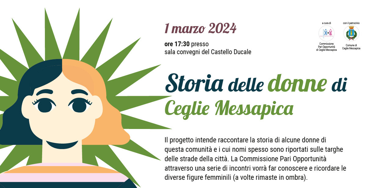 CEGLIE MESSAPICA – Si terrà venerdì 1 marzo 2024, dalle ore 17:30, presso il Salone del Castello Ducale di Ceglie Messapica, il primo di una serie di incontri organizzati dalla locale Commissione Pari Opportunità nell’ambito del progetto “Storie delle Donne di Ceglie Messapica”, che intende raccontare la storia di alcune, note, donne di questa comunità e i cui nomi spesso sono riportati sulle targhe delle strade della città. La Commissione Pari Opportunità attraverso una serie di incontri vorrà far conoscere e ricordare le diverse figure femminili (a volte rimaste in ombra). Gli incontri fanno parte di un excursus storico tutto al femminile che ha l’obiettivo di approfondire e di far conoscere alla comunità il loro operato: sono donne che appartengono trasversalmente a tutti i ceti sociali, che hanno lavorato duramente e silenziosamente nei campi, o all’interno delle mura domestiche, o artigianalmente con cura minuziosa chine sui telai o sulle macchine.